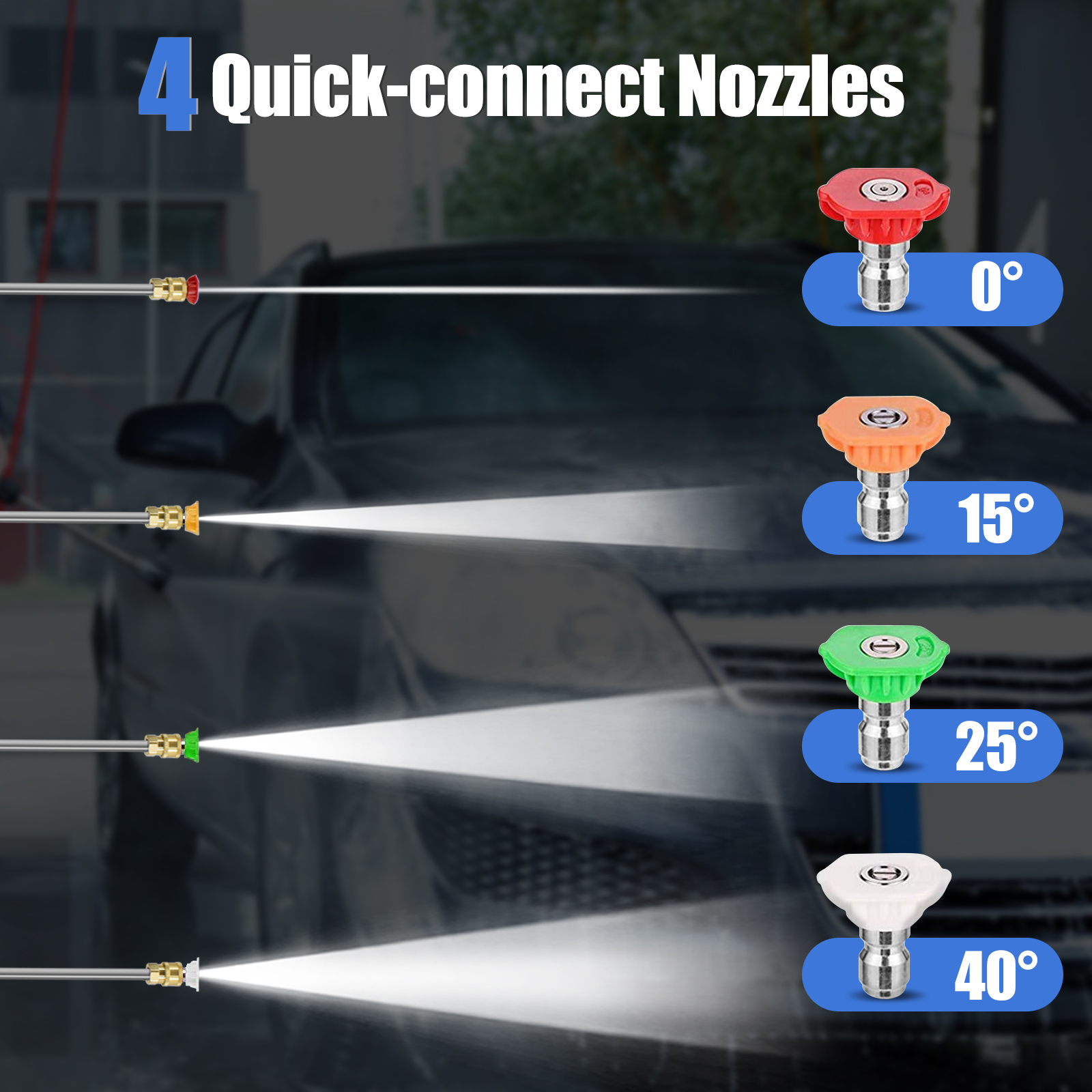 - [Fully equipped]: Any Cleaning Area – 0� – for stubborn stains; for crevices in sidewalks or driveways; 15�- for concrete, brick, high and hard to reach areas; 25�- for painted surfaces, wood siding, fences and mowing machine; 40�- for cleaning windows and screens, as well as spraying soaps and detergents.